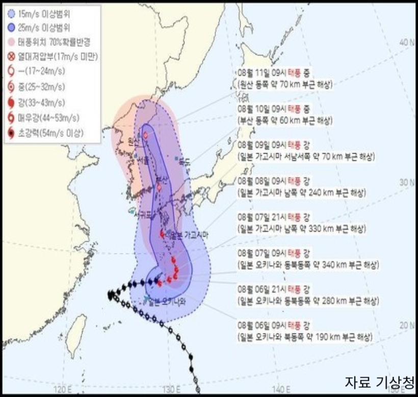 구체적으로 10일 오전 9시 부산 남서쪽 90km 부근 해상에 도달하고, 이후 계속 북진해 11일 오전 9시에는 함흥 남서쪽 약 40km 부근 육상으로 이동한뒤 약화될 것으로 보입니다.